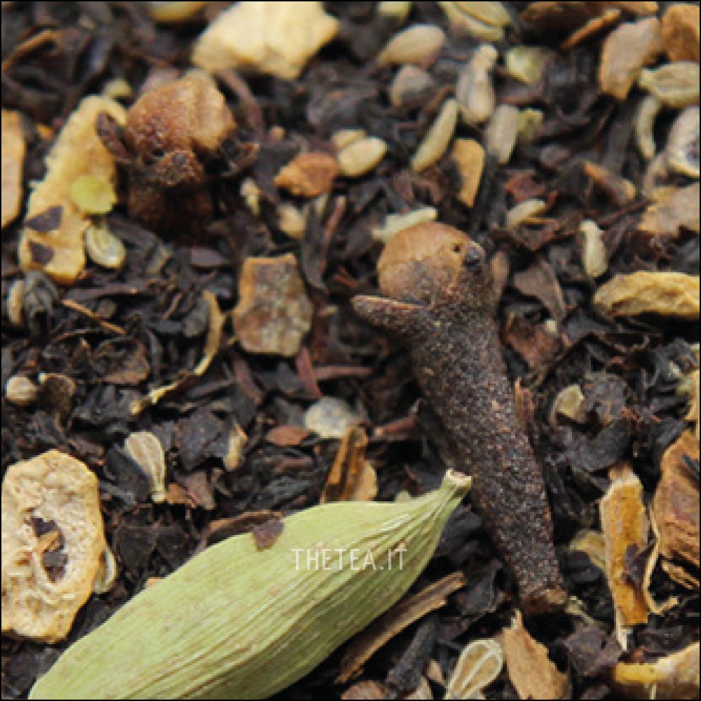 Ingredienti: tè nero indiano, cannella e zenzero in pezzi, chiodi di garofano, semi di cardamomo e di anice, pepe nero.