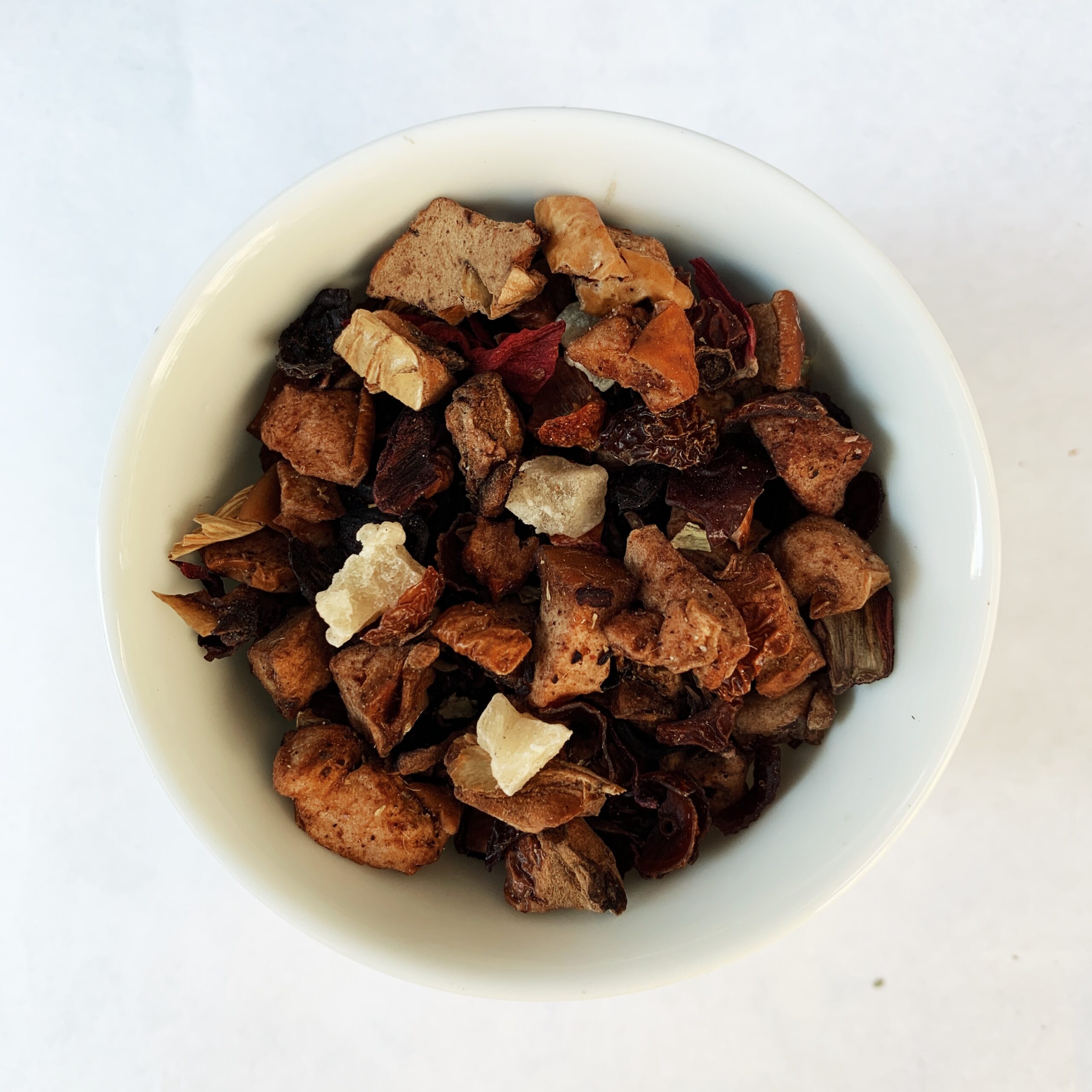 | Carcadè, rosa canina, pezzetti di mela e pera, petali di girasole, cubetti di ananas, cannella in pezzi,aromi. |