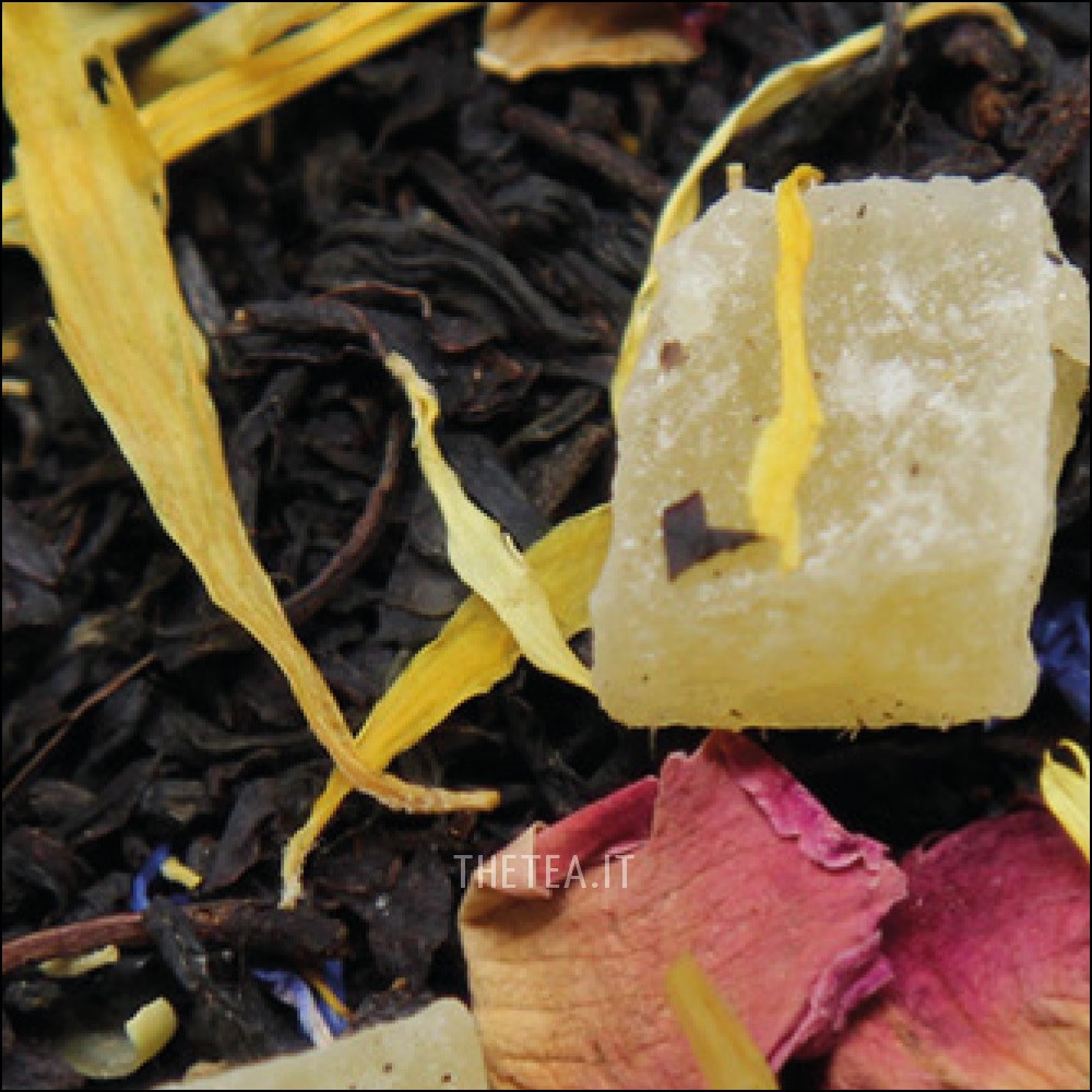Ingredienti: blend di tè neri Ceylon, Sud-India e Cina, mango candito (mango, zucchero), aroma naturale, calendula, petali di rosa, fiordaliso.